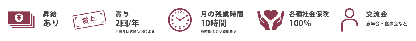| 待遇 | 各社会保険完備/昇給・賞与あり(※会社業績による)/交通費規定支給/資格手当あり |